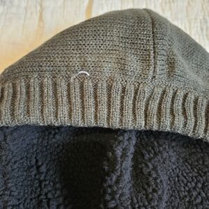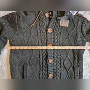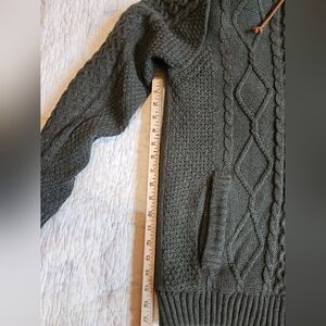 Mens American Stitch cardigan-style hooded jacket in hunter/forest green. Perfect for a cozy look! Listed on tag as "olive." Button close front with large brown buttons. Brown elbow patches. Cableknit with sherpa lining. Hood has a functional drawstring. This item is dry-clean only.