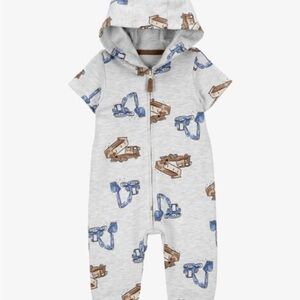 Adorable gray hooded baby romper featuring a playful construction vehicle print in blue and brown. Perfect for little ones.