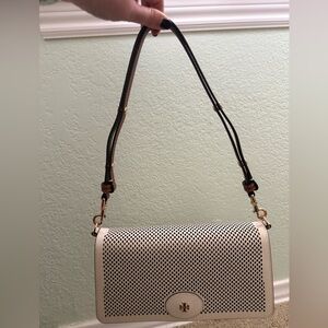 Stylish Tory Burch clutch with a black and white pattern. Perfect for any occasion.