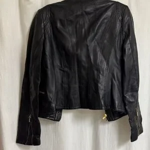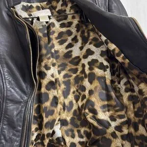 Sleek black leather jacket by Cache. Features bold leopard print lining. Adds edge to any look.