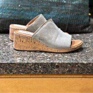 Wedge, platform, slide-on open-tow sandals in a light gray suede. Cork wedge heel and a cushioned footbed. The brand "boc" is a sub-brand of Born, known for comfortable and well-crafted footwear. These sandals are described as lightweight and suitable for all-day wear, pairing well with casual outfits. The upper material is suede with a synthetic or rubber sole.