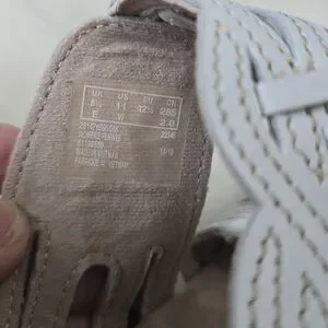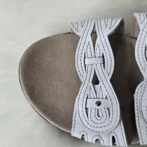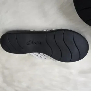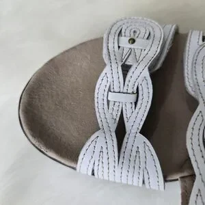 Clarks sandals featuring a braided strap with rivet accent. These sandals boast multiple adjustable straps for a personalized fit and a cushioned footbed for superior comfort. The low-profile sole and open-toe design make them perfect for casual outings.