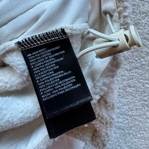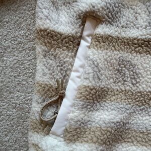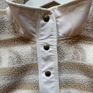 This fleece is super cozy and warm, and I love the neutral color palette. This has only been worn once and is in excellent condition. The buttons on the next snap all the way up to have a standing collar when it’s super cold, and the zip pockets are warm. Elastic pull at hem if a more cinched look is wanted. Size medium. I live in a smoke-free/pet-free home.
