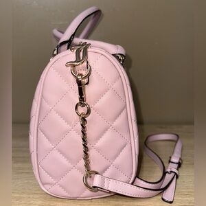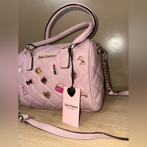 Elegant Juicy Couture satchel in blush pink. Features quilted design with playful embellishments. Perfect for adding charm to any outfit.