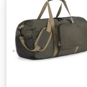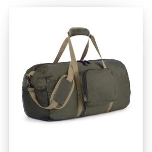 Stylish olive forest green duffel bag perfect for travel or gym. Durable and spacious with convenient pockets.