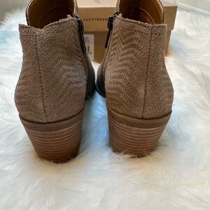 Lucky Brand PARNESA taupe tan beige textured suede nubuck leather ankle boots booties. Women’s size 6.5 with a 2 1/2” heel. Perforated suede. In great preowned condition, like new! Only worn 3-4 times. Please see all photos for any flaws.