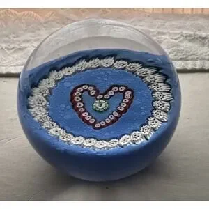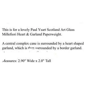 The VTG Paul Ysart Scotland Art Glass Millefiori Heart & Garland Paperweight is a handmade vintage glass piece crafted in Scotland. This art glass paperweight features a heart-shaped design with a multicolored Millefiori pattern, symbolizing love and remembrance. The intricate craftsmanship and unique design make it a beautiful and nostalgic addition to any collection or decor. Made by renowned brand Paul Ysart, this paperweight is a stunning representation of traditional Scottish artistry.