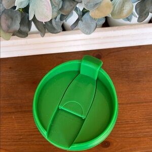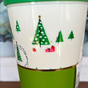 Kate Spade New York Festive travel mug. Features a vibrant green lid and whimsical design on a white base.