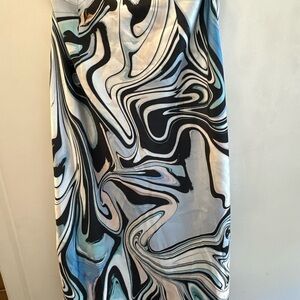 Stylish midi skirt with a swirl pattern. Features black, white, and blue colors. Perfect for a chic look.