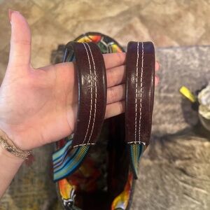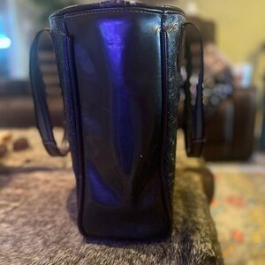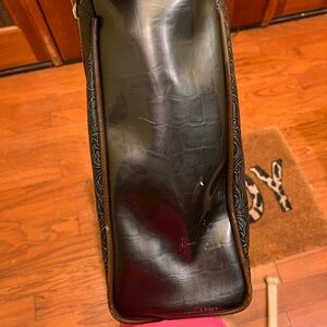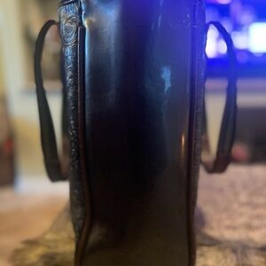 Stylish black tote with colorful floral embroidery. Features multicolored striped handles. A couple white scuff marks on the sides. Some wear and tear on the top rim part of the bag.