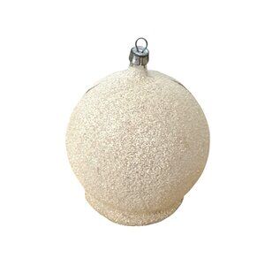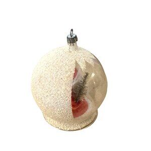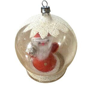 This vintage 3-inch glass Christmas ornament features a charming Santa Claus diorama encased in a clear globe. The ornament is accented with detailed mica snow for a festive touch. Made in West Germany, it showcases traditional craftsmanship and a nostalgic holiday aesthetic. A metal topper and hanging loop ensure easy display, making it a unique addition to vintage ornament collections or holiday decor.