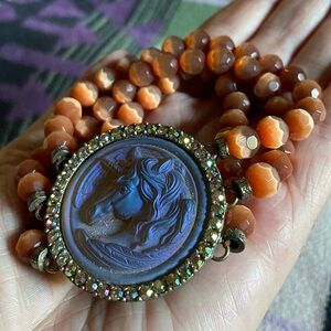 Wear a bit of Dreamy Unicorn Magic & Love with 3 stretch strands of shimmering faceted burnt ombré orange cats eye beads & one of Kirks Folly's most beloved collectible & iconic opaque glass High Relief Unicorn is surrounded by shimmering colorful