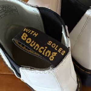 Stylish white heeled boots with chunky sole. Iconic Dr. Martens design.