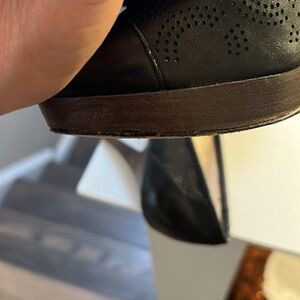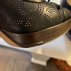 Chic black leather heels by Coach. Features bow detail-issues are in great condition and perfect for that Goth school girl vibe! Heel size- 4.75 in with a platform