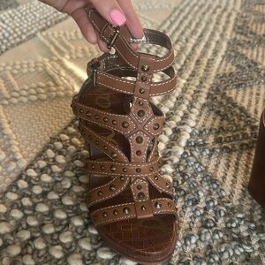 Elevate your style with these chic studded brown strappy heels. Perfect for any occasion, these shoes offer both comfort and elegance.