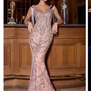 This stunning evening gown features intricate beadwork and a flattering silhouette. Perfect for special occasions, the nude color adds a touch of elegance. Ladivine CR879 worn once good condition size 6 adjusted to fit size 2