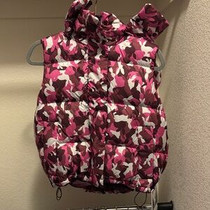 . Stylish puffer vest with a pink and brown camouflage pattern. Perfect for layering. No low balls. Could fit a size 6. Willing to trade for alo or lululemon black puffer vest
