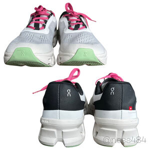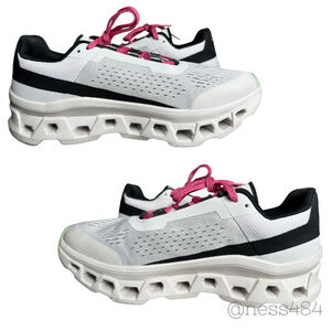 This is a pair of pre-owned On Cloudmonster running shoes, size US Mens 8.5/Womens 10. They feature a white mesh upper with black accents and bright pink laces. The distinctive CloudTec sole is white with light green rubber sections on the outsole. Branding includes "CLOUDTEC" on the side and "SWISS ENGINEERING" on the heel. These are in EXCELLENT used condition, I only wore them a handfule of times.