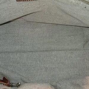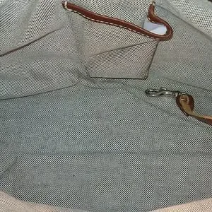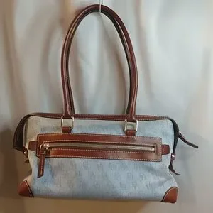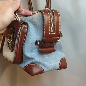 Stylish satchel with dual front pockets. Blue fabric with brown leather accents. Perfect for everyday use.