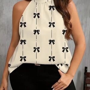 This elegant women's top features a chic cream color adorned with a stylish black bow print. Perfect for any occasion, this top offers a sophisticated look with a modern twist.