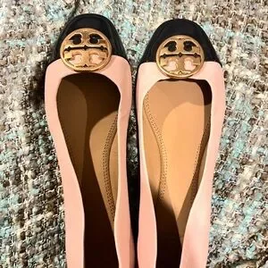 Elegant flats with a pink body and black toe. Gold Tory Burch emblem on top. Perfect for versatile styling.Nee with no tags