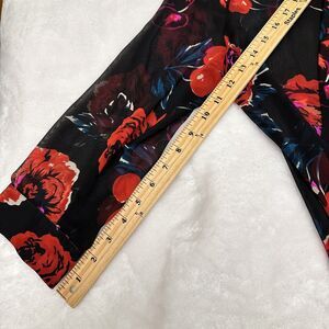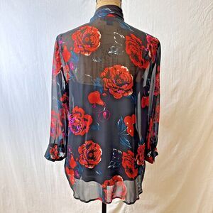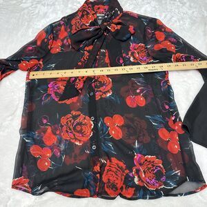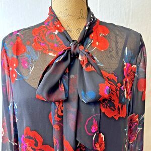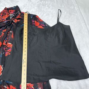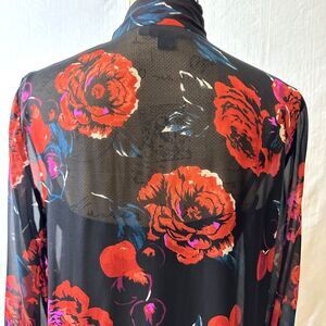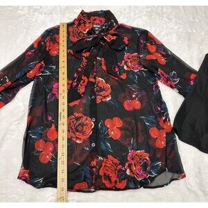 DKNY Black Red Floral Neck Bow Tie 3/4 Sleeve Semi-Sheer Blouse w/Camisole Sz M