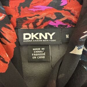 The DKNY Black Red Floral Neck Bow Tie 3/4 Sleeve Semi-Sheer Blouse with Camisole in size M is a stylish and versatile top suitable for various occasions. Made from silk and elastane, this blouse features a beautiful rose and cherry pattern, a bow tie neckline, and long sleeves with a button closure. The black color and sheer accents add a touch of elegance, making it a perfect choice for parties, casual outings, or business settings. Perfect for any season, this designer blouse by DKNY is a must-have for women looking for a chic and colorful addition to their wardrobe.