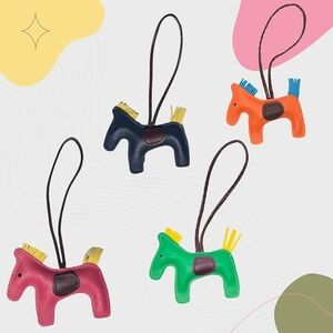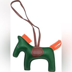Charming green horse bag charm with a brown saddle and orange accents. Perfect for adding a playful touch to your bag.