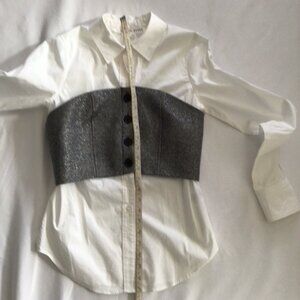 Feminine top features a white button down base made of cotton and elastane with a grey wool blend corset accent.