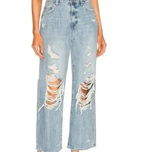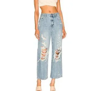 77% cotton, 23% rayon. Made in China. Machine wash. Zip fly with button closure. 5-pocket styling. Light whiskering and destroyed detail. 14" at the knee and 14" at the leg opening. Revolve Style No. PSTL-WJ175. Manufacturer Style No. P6518KEE.