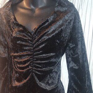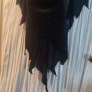 Fabric is velvet like, featuring pull on style with a single keyhole Velcro closure behind the neck. Features low cut v neck with ruching fabric to accentuate bust and minimize the waist, asymmetrical villainous cut at the hem of sleeves and bottom of dress. Attached ties can be worn in front or in back. Fabric is stretchy, and light weight, Worn once, great pre owned condition, perfect for base dress for any Villain themed costume. Maleficent, Elvira, witch, and more.