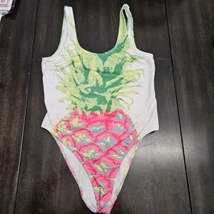Vibrant one-piece swimsuit with a pineapple print. Features green, pink, and yellow colors.