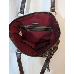 Step back into retro style with this vintage Rosetti tote bag. Features a bold multicolor swirl floral design with chocolate brown faux leather trim and silver-tone accents. Roomy interior is lined in burgundy fabric with one zippered pocket and two open compartments. Double shoulder straps for easy carrying.