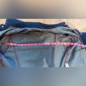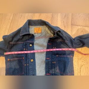 Classic blue jean jacket. Features gold buttons. Stylish and versatile.