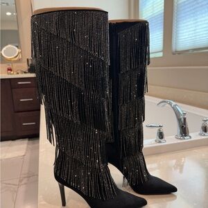 Step out in style with these elegant black fringe knee-high boots. Perfect for adding a touch of sophistication to any outfit.