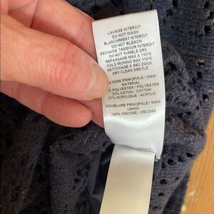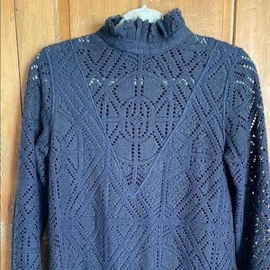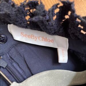 See by Chloe navy eyelet long sleeve dress with sheer deep V-neckline and sheer long sleeves. Ruffled high collar with lining on body. Rear zipper and inner button closure. Excellent condition