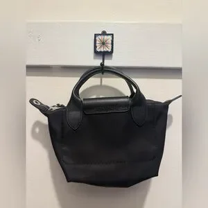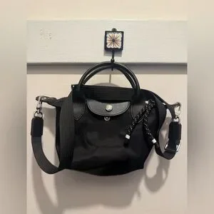 The Le Pliage Energy Recycle Canvas XS by Longchamp is a stylish shoulder bag perfect for women. Made from black canvas material, this bag features a solid pattern with silver hardware accents. It includes a detachable strap for added versatility and has a zip and drawstring closure for security. This fashionable yet functional bag is ideal for everyday use and perfect for adding a touch of sophistication to any outfit.