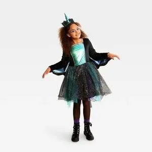 Enchanting kids unicorn costume featuring a shimmering teal and black dress. Perfect for magical adventures and imaginative play.