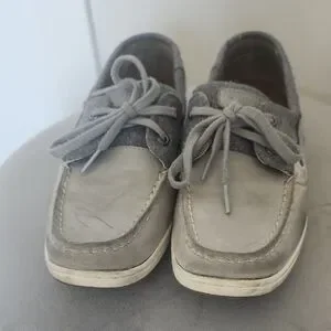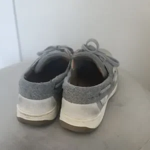 Classic Sperry loafers in gray. Features a sturdy white sole. Perfect for everyday wear.