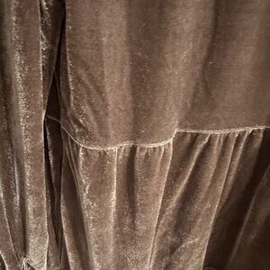 Great condition. Buttons up the front. Wear open or closed. Pockets on both sides. Tiered baby doll fit. Pockets on front. Wear as tunic or dress depending on height. Super cute!!! Looks like velvet. Color is taupe. Very flowy and comfortable.