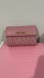 Elegant pink wallet with quilted design. Features gold logo detail. Perfect for adding a touch of luxury.