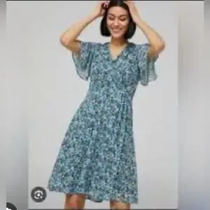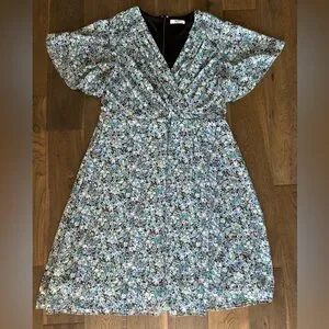 Pretty floral, wrap dress from Suzy Shier. Fully lined and has a hook n eye closure and zip at back. Worn once. Pit to pit is 19 inches and length of dress is 40 inches. There is no stretch in this dress. From a pet free and smoke free home.