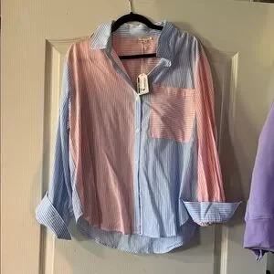 Stylish button-up shirt with blue and pink stripes. Features a front pocket and classic collar. Size large. Brand new with tags.
