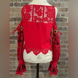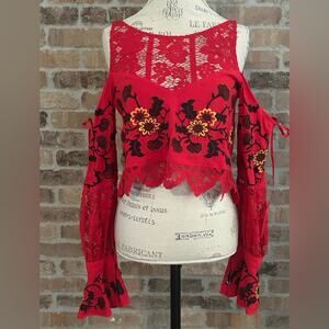 For Love & Lemons $211 Cecelia Crop Top Hot Red sunflower revolve embroidered L