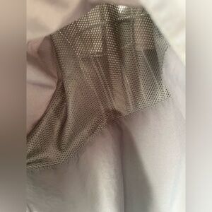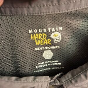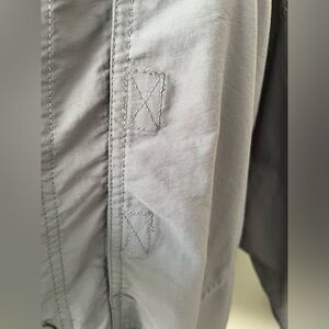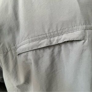Men’s size XXL grey Mountain Hardware fishing-style shirt to terrific condition. The shirt has two front pockets (both pictured)…one zip and one velcro, and both have the meshing behind them. There is also mesh ventilation under the arms and down the sides, as well as under the back flap, all pictured. The only flaw I could find was a tiny black dot on the back of the left shoulder, also pictured. The buttons are slightly rubbery/“grippy” and the measurements are in the listing. Versatile color that will go w/anything!