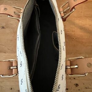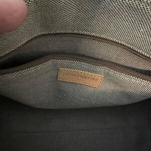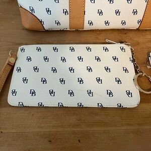 Vintage Dooney & Bourke canvas logo bag with matching luggage tag and wristlet. In pristine condition on outside and inside. No wear at all and not one mark inside. This is rare to find a bag in this condition. Timeless elegant bag that goes with any classic style. Unbelievable price for all 3 pieces.
