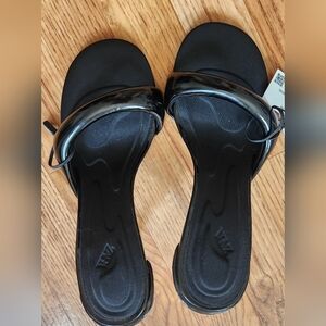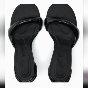 Sandals with faux patent leather. Quilted strap at upper. High heels with sculpted detail. Round open toe, Mule, Slip Ons