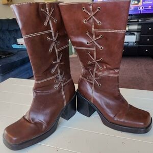 Stylish brown heeled boots. Features lace-up design. Perfect for any occasion.