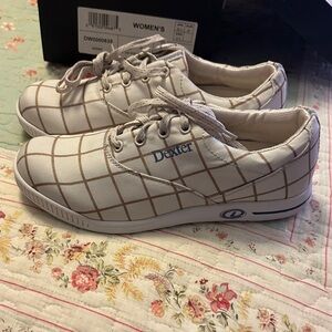 Stylish Dexter women's bowling shoes with a plaid design. Features a beige and brown color scheme. Brand new in box and never worn. From a pet friendly and smoke free home.