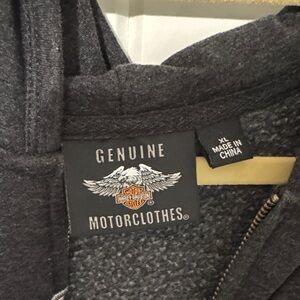 Charcoal hoodie with shimmer silver Harley-Davidson logo. Skull graphic on front. Full zip closure.